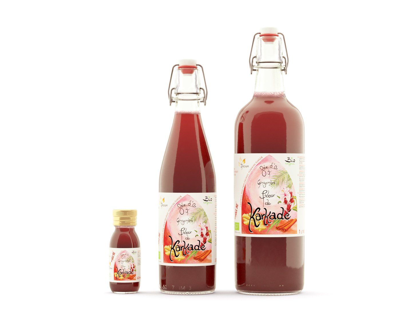 Für diese Shots hatten wir die Idee, unser gesamtes Saftsortiment in 60-ml-Versionen herauszubringen, mit den gleichen Etiketten wie die großen Flaschen (wie auf dem Foto oben), um unserer grafischen Identität treu zu bleiben.